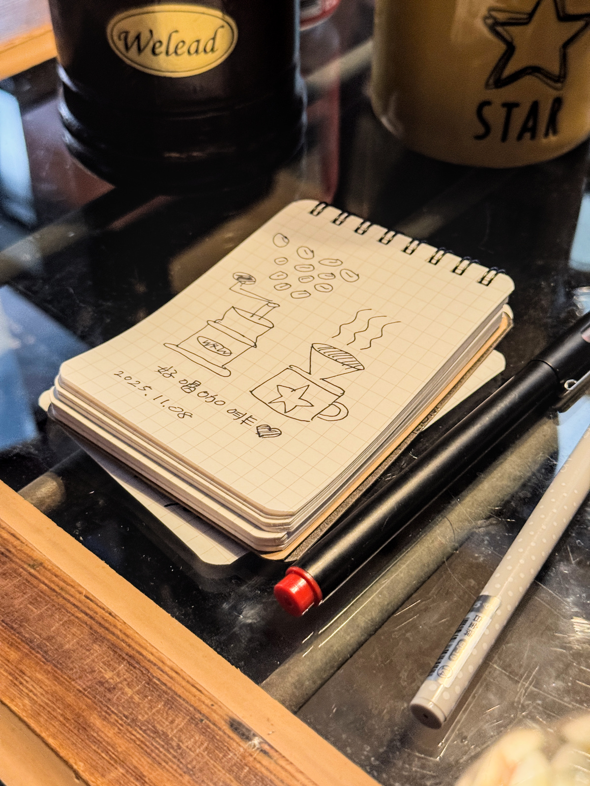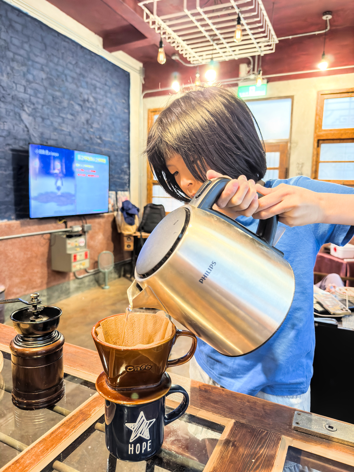 ▲▼在寬宅一九六零,你可以體驗到充滿生活感的在地旅行。這裡雖然沒有提供制式早餐,但最棒的體驗是DIY手沖咖啡!屋主備有全套的咖啡磨豆機和濾杯器具。我們六個朋友輪流動手磨豆、手沖,聽著水壺發出咕嘟咕嘟的聲音,空氣中瀰漫著濃郁的咖啡香氣,再買瓶牛奶做成拿鐵,那份溫柔與滿足感,是其他包棟民宿無法比擬的。甚至,我在這裡還畫下了這份美好的手沖咖啡時刻筆記,讓味覺與視覺都留下了深刻的記憶。