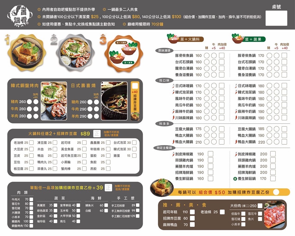 除了各式湯底的小火鍋,菜單上還提供韓式銅盤烤肉(個人版的韓式烤肉+小火鍋雙重奏)和招牌炸豆腐等特別品項,可單點加點搭配。用餐時每人低消一鍋,但如果怕不夠過癮,也能加點肉品、海鮮或小菜;店家甚至不定期推出優惠活動,肉食族們有福了!
