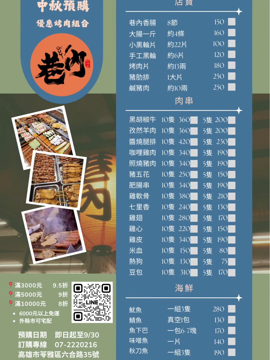 重點是現在預購還有早鳥折扣,越早訂越划算,滿額還能享免運。肉串、店賣、海鮮通通有,想吃什麼都可以客製組合。