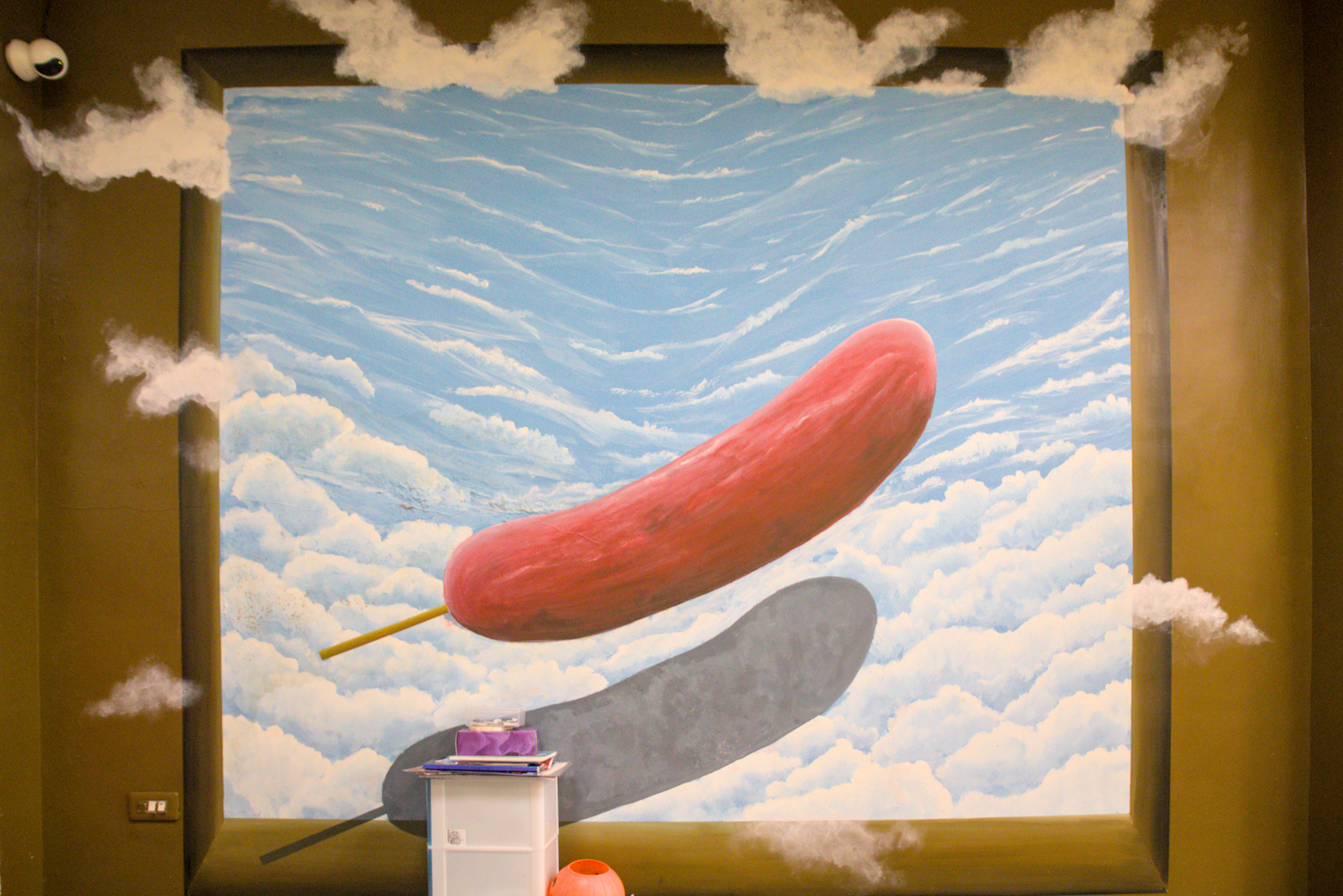 ▲走進巷內香腸,不只聞得到炭烤香氣,還能看到許多充滿巧思的佈置。牆上有一幅巨大香腸飛翔在雲端的立體畫,讓人忍不住停下來拍照打卡。