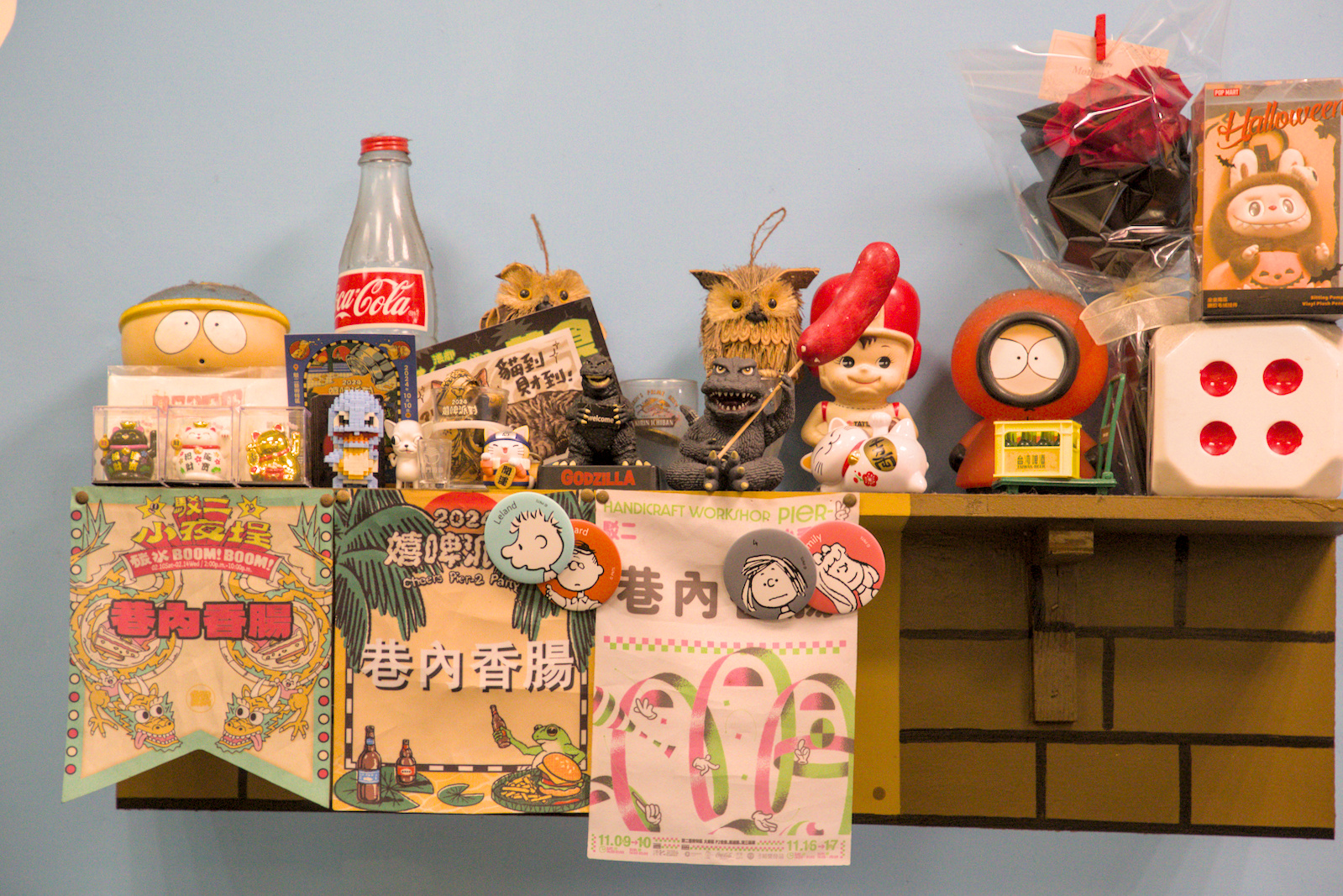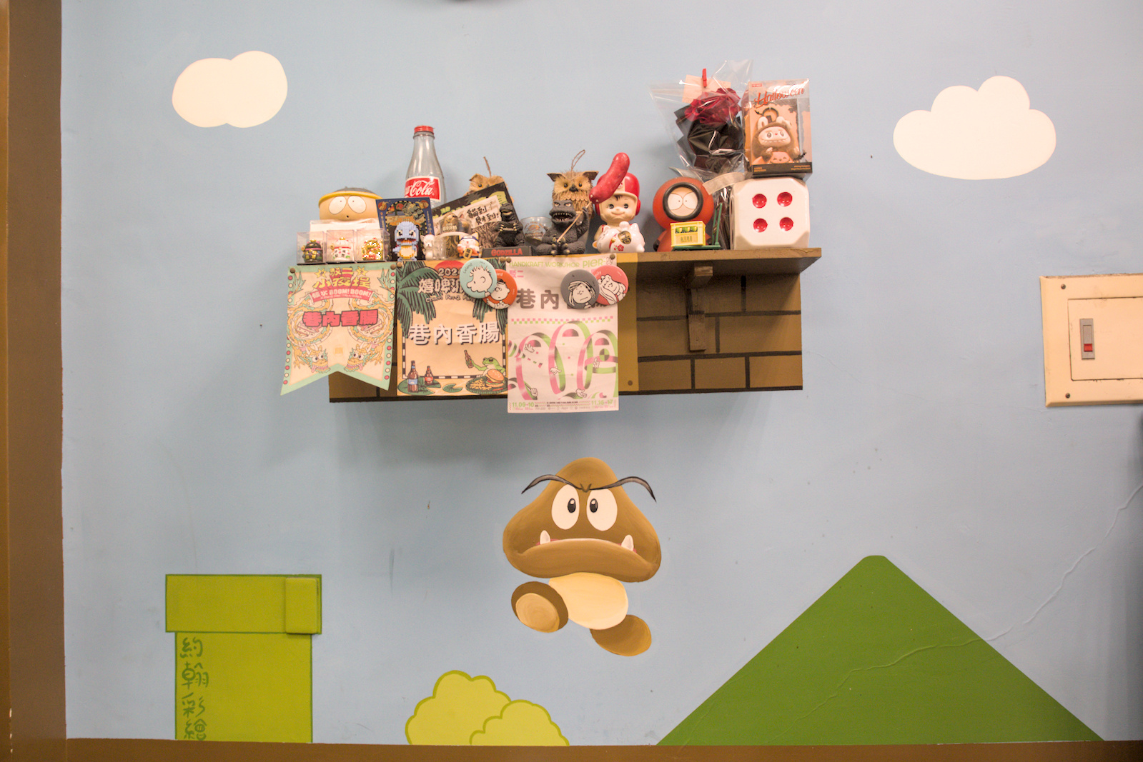 ▲▼另一邊則是滿滿收藏,像是老闆在市集收集回來的錦旗、紀念徽章和小玩偶,搭配超級瑪利歐的塗鴉元素,營造出輕鬆有趣的氛圍。這些細節讓小小的店面多了一份親切感,也讓「吃香腸」變成一種帶點童趣的體驗。