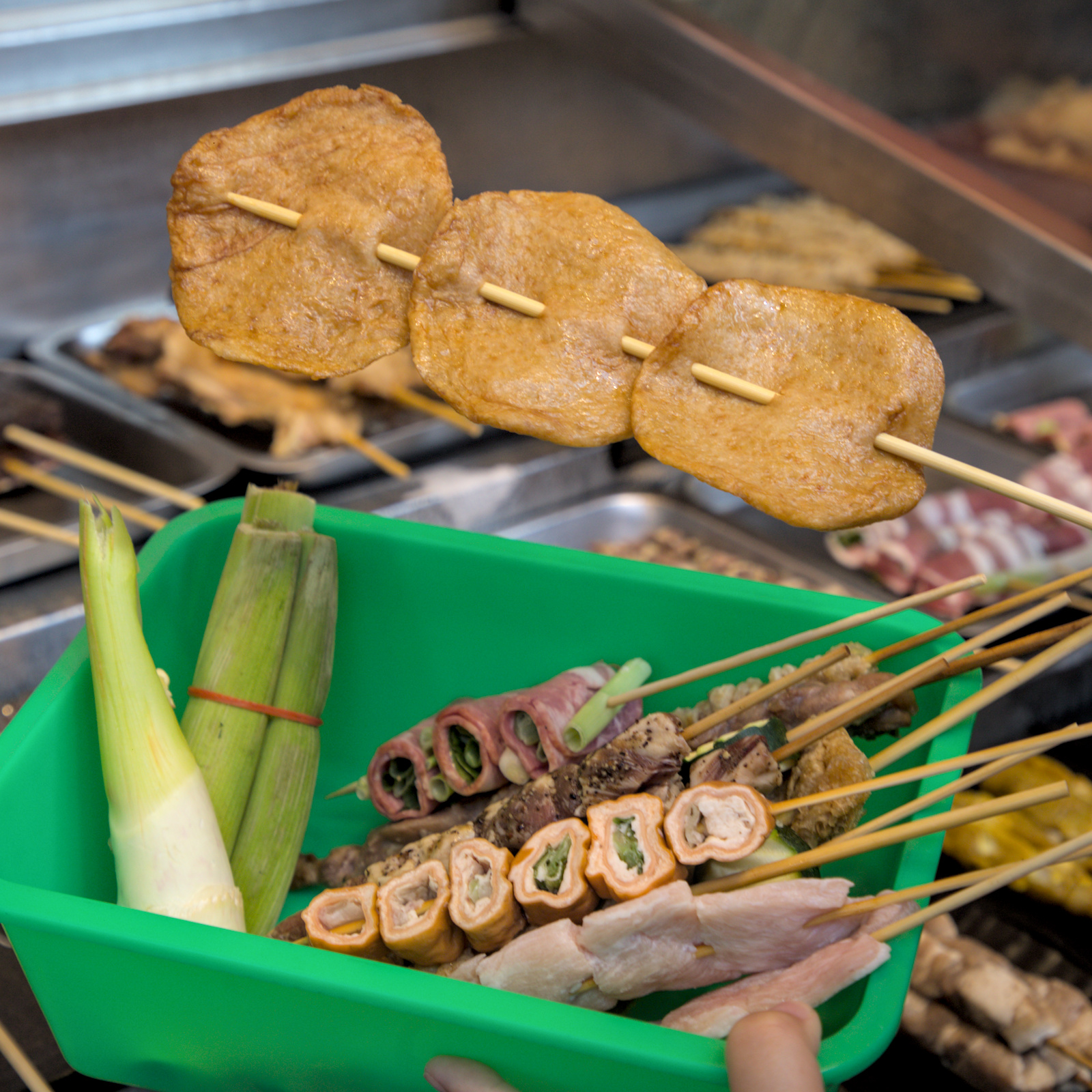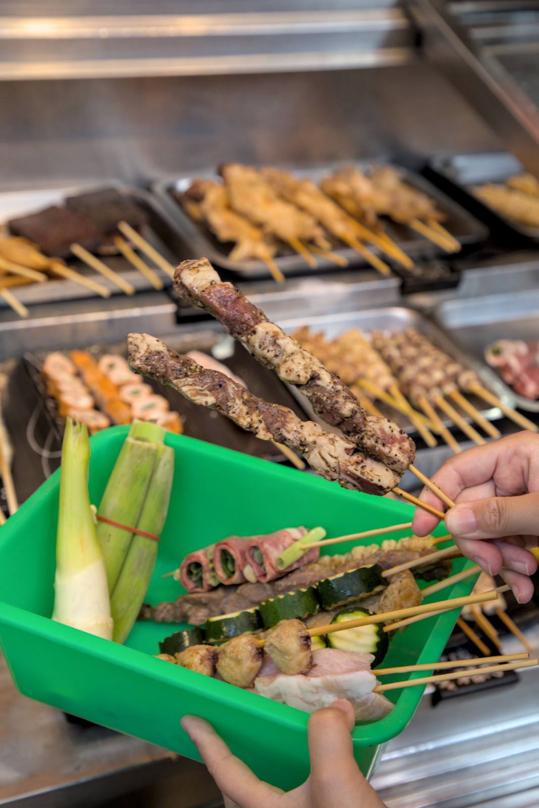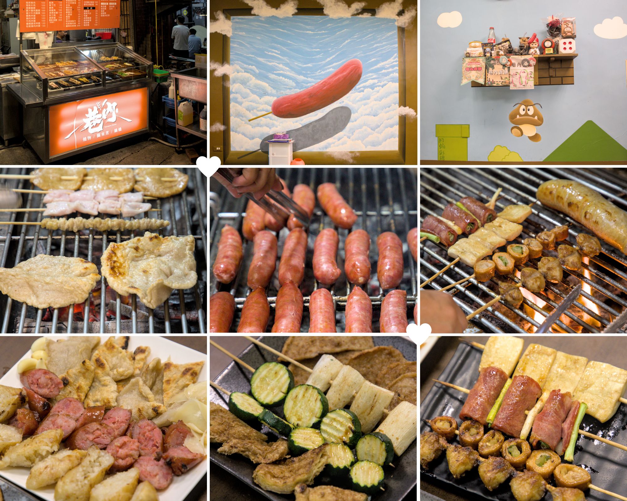 ▲▼店門口設有透明的櫥窗,裡面擺滿了各式各樣的串燒食材,種類豐富到讓人眼花撩亂。你可以拿著籃子,自由挑選想吃的品項,再交給店家進行炭烤。點餐區旁邊還有一幅有趣的壁畫,畫著一根飛在雲朵中的巨大香腸,非常適合打卡拍照。