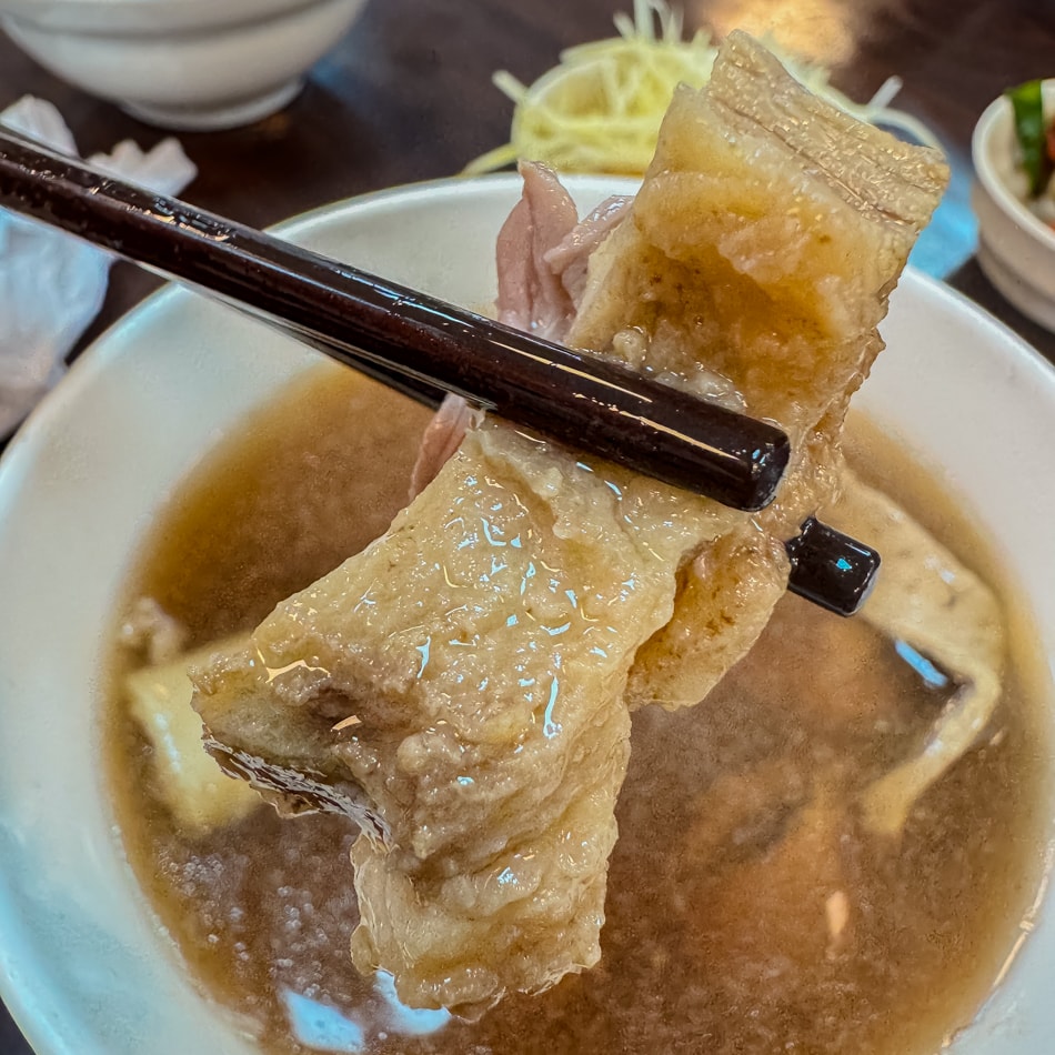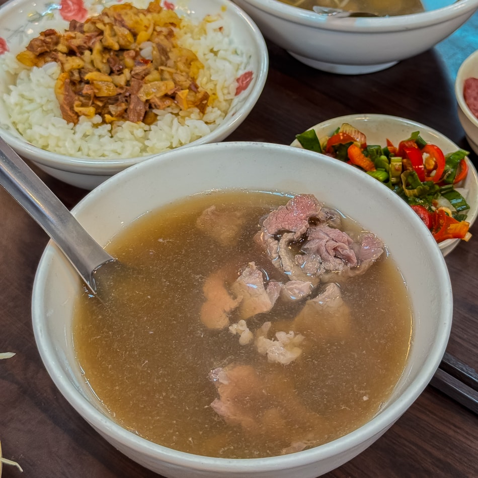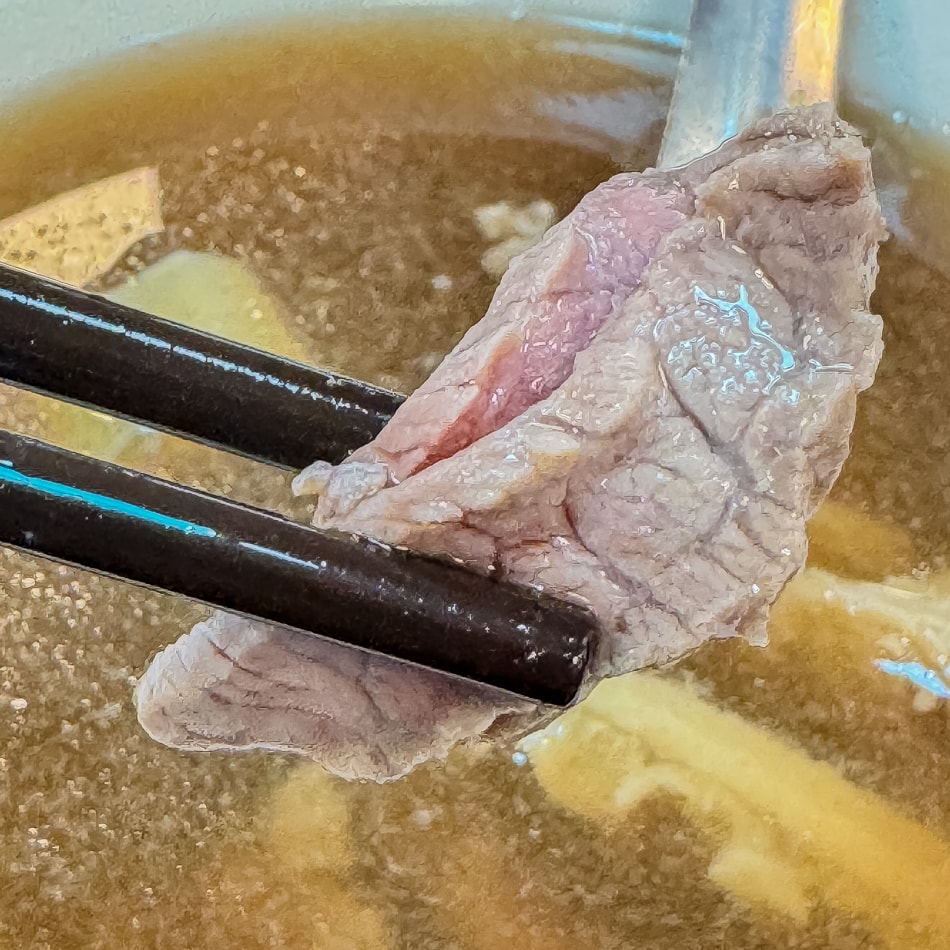 牛肉湯是這裡的招牌,選用台南溫體牛,現沖湯頭清甜,牛肉片粉紅色澤,口感軟嫩。可搭配薑絲與店內特製沾醬,提味更佳。