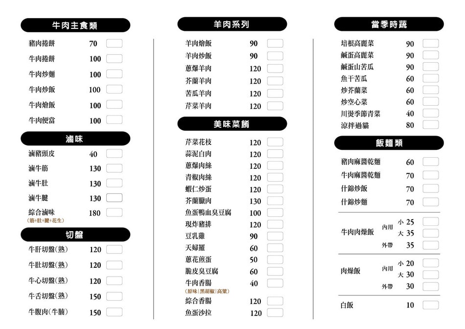 店內提供各式牛肉湯、炒牛肉、牛肉飯麵、滷味、精緻小菜,價格親民。以下是部分菜單品項: