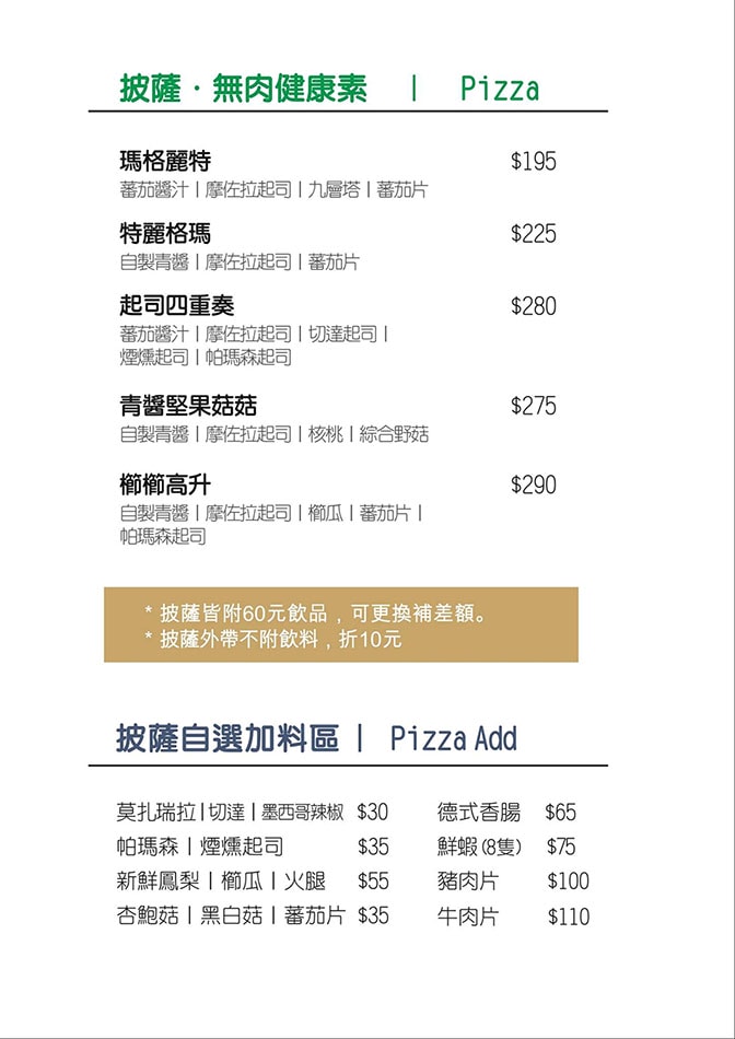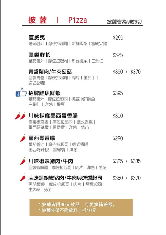 - 天然酵母披薩:價格範圍 195 元至 370 元