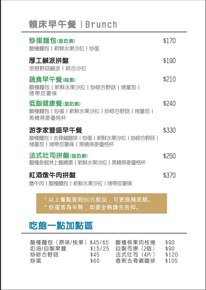 - 賴床早午餐:價格範圍 170 元至 370 元