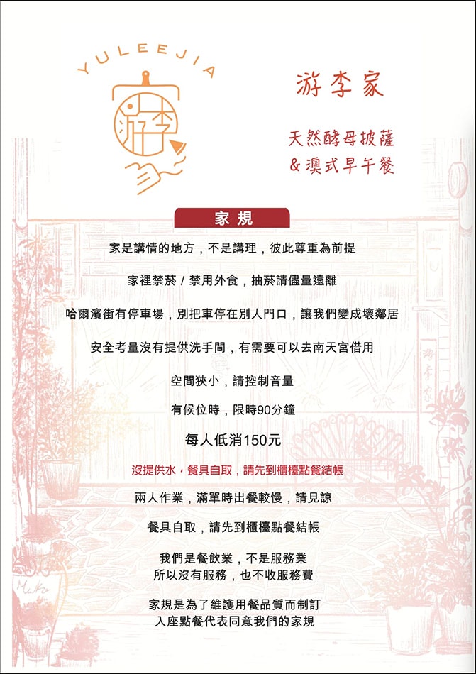 - 特色餐點與飲品:游李家以天然酵母披薩與澳式早午餐為主打,並提供多種無咖啡因飲品、紅茶、可可與咖啡。