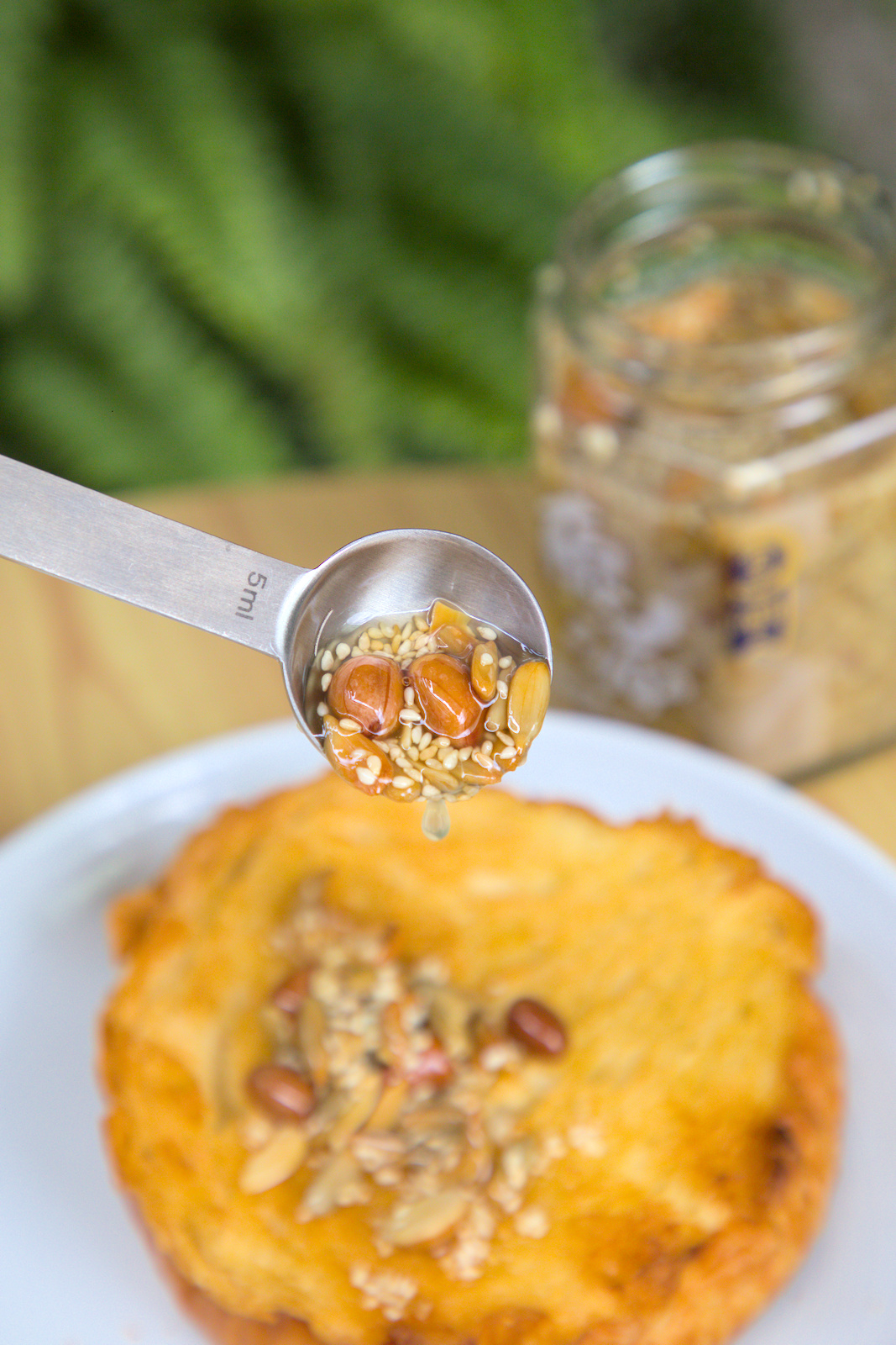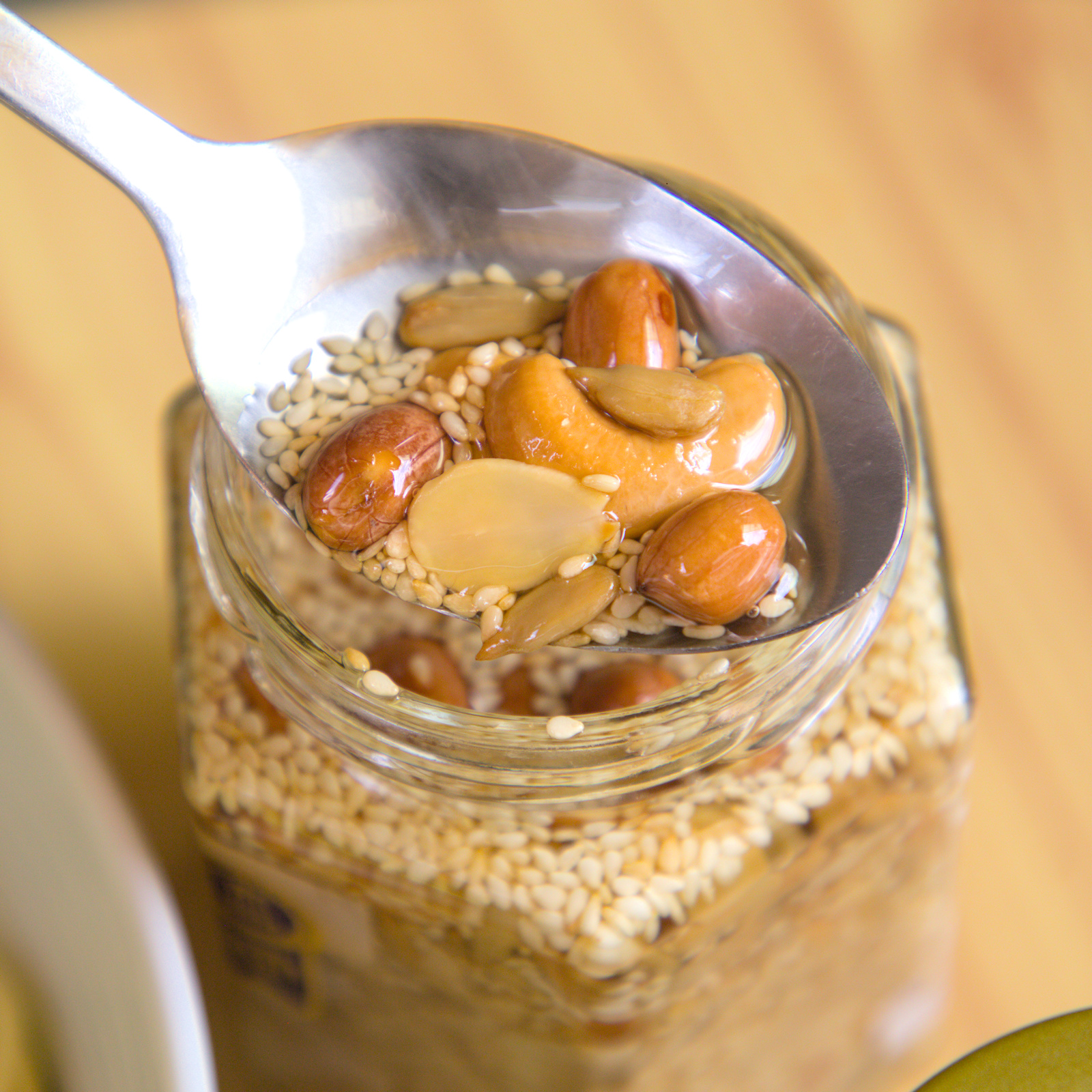 五仁胡麻果油用途很多、料體豐富。放一罐在冰箱,臨時想吃點什麼,挖一匙就能把日常料理升級。