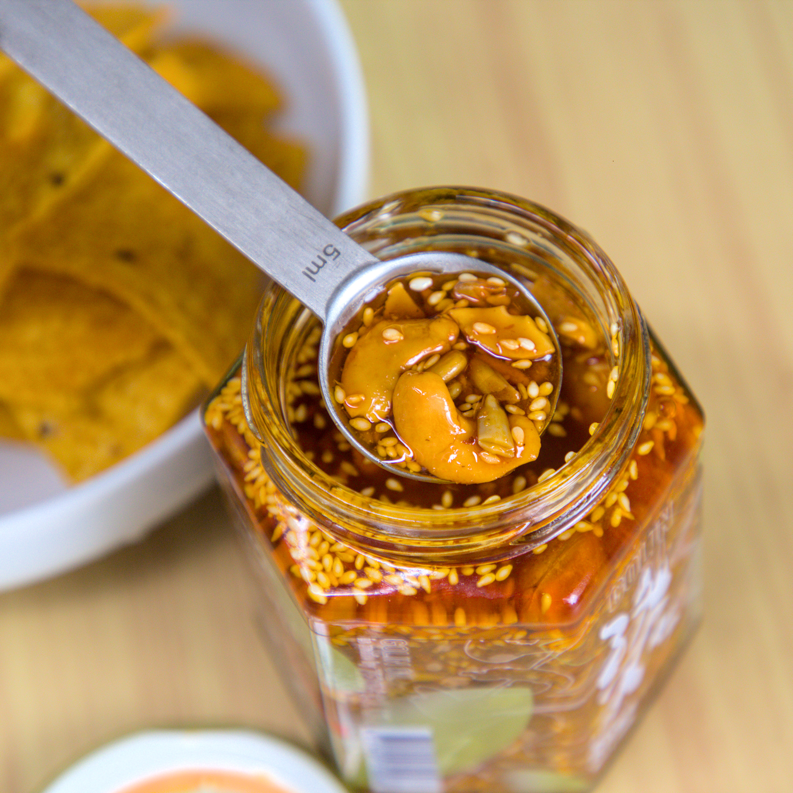 重口味代表。辣椒與花椒的麻辣疊在堅果香上,拌麵、拌飯、當下酒小菜都很涮嘴。