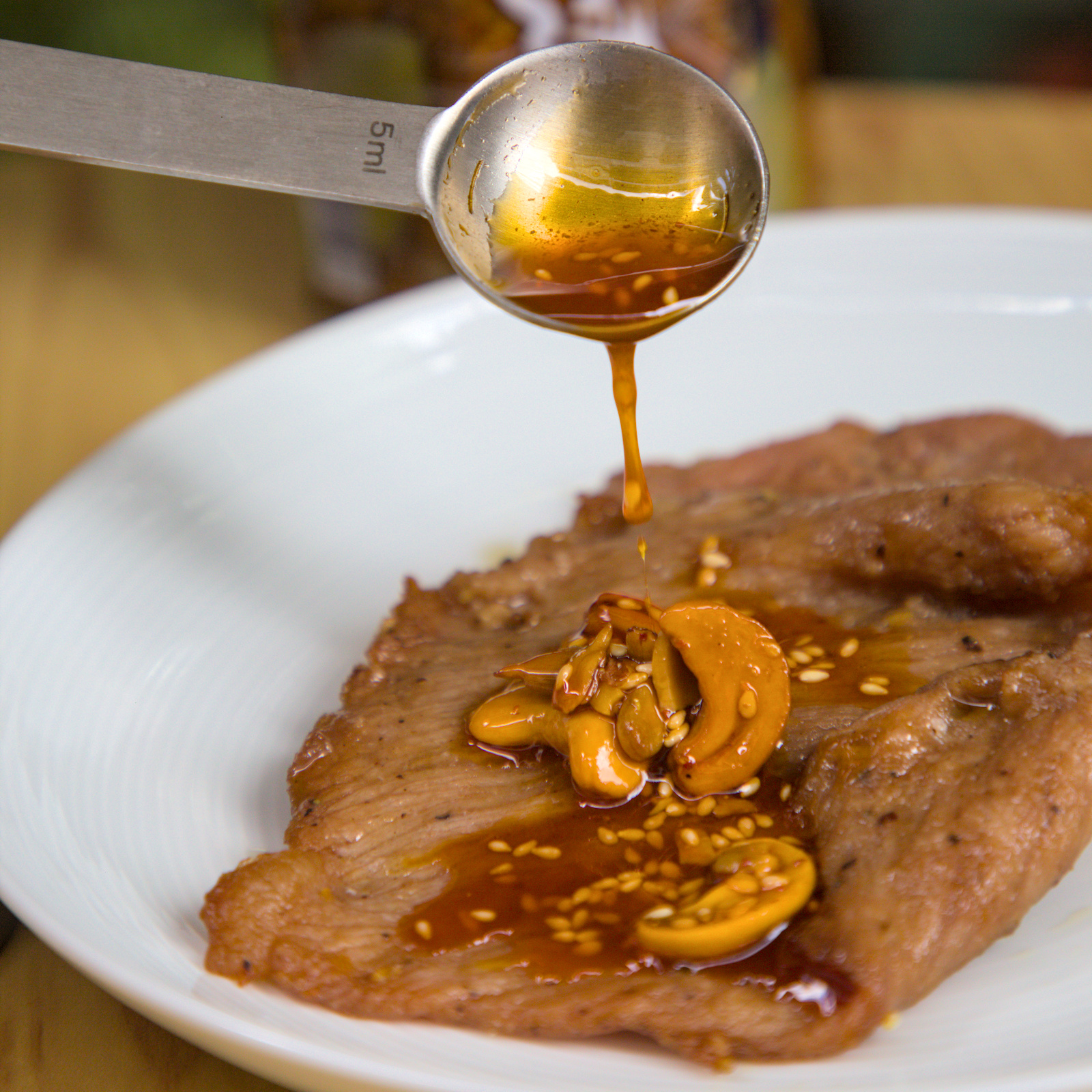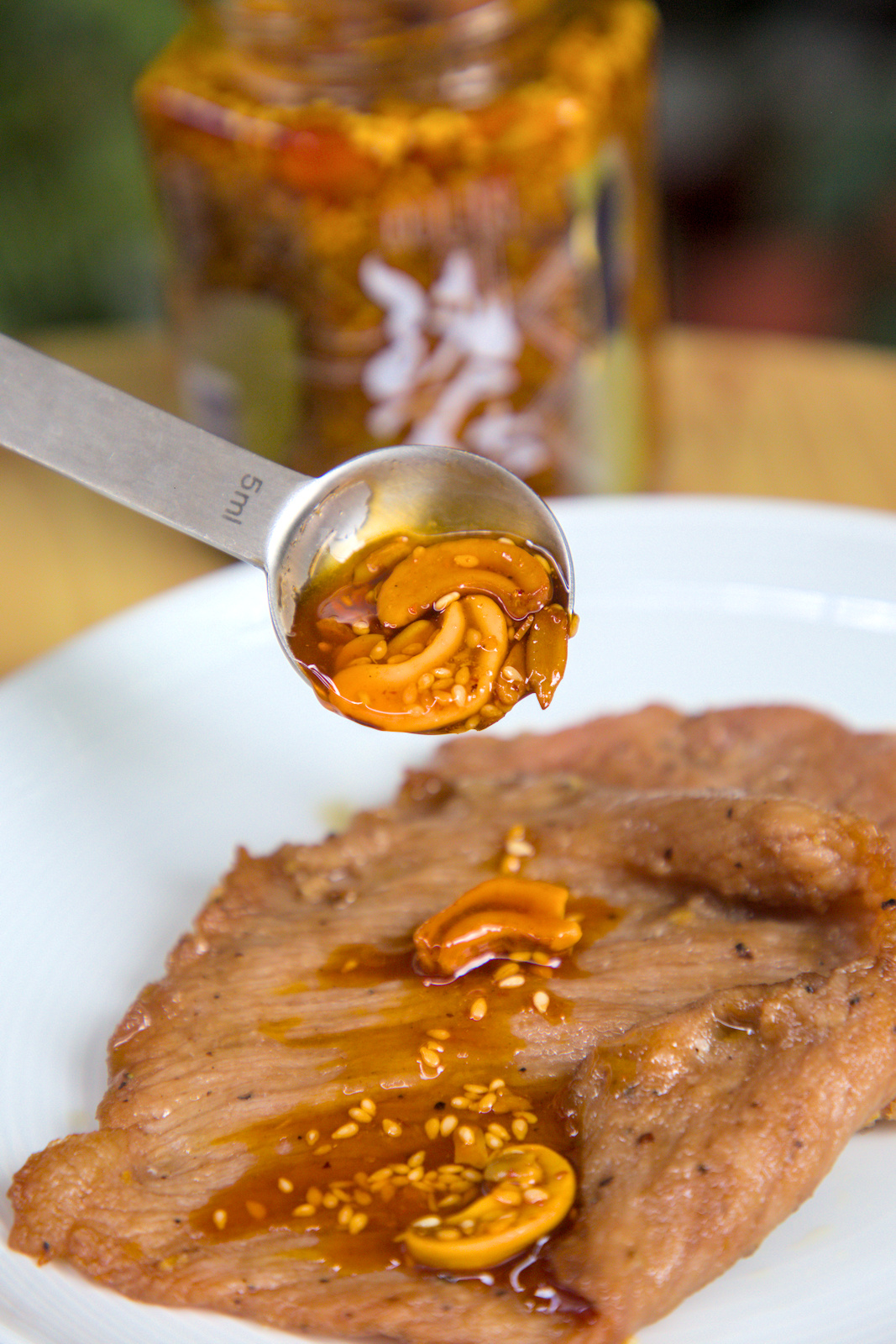 ▲▼簡單的燒肉片,淋上一匙五仁果油,堅果香氣和肉汁完美融合。